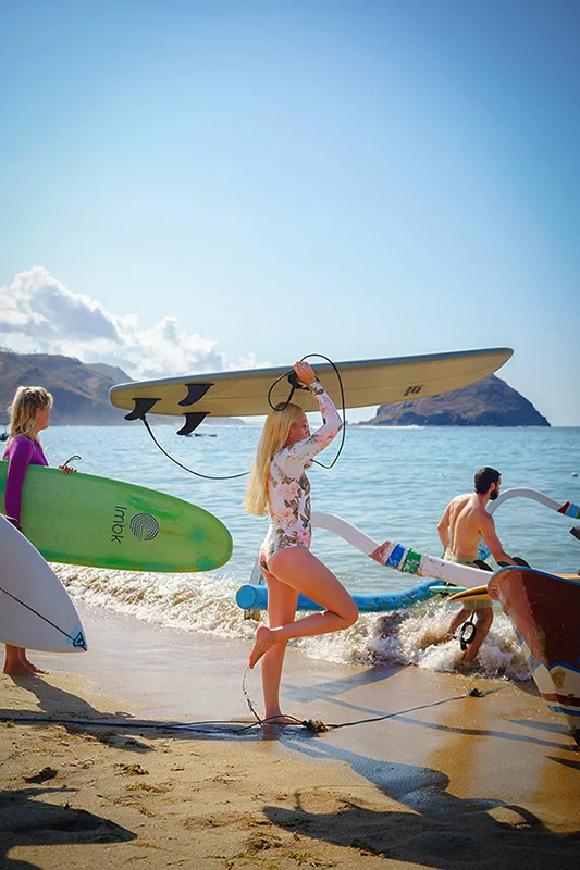 Die meisten Tage beginnen mit einem frühen Frühstück, gefolgt von einer Surf-Session, die auf Ihr Können zugeschnitten ist. Nach einer Mittagspause und dem Mittagessen beinhalten einige Tage eine zweite Surf-Session, Surf-Theorie-Klassen, Yoga oder Surf Skate Sessions. Abende bieten oft Familien-Abendessen, Sonnenuntergangs-Ausflüge oder Foto-Analyse.